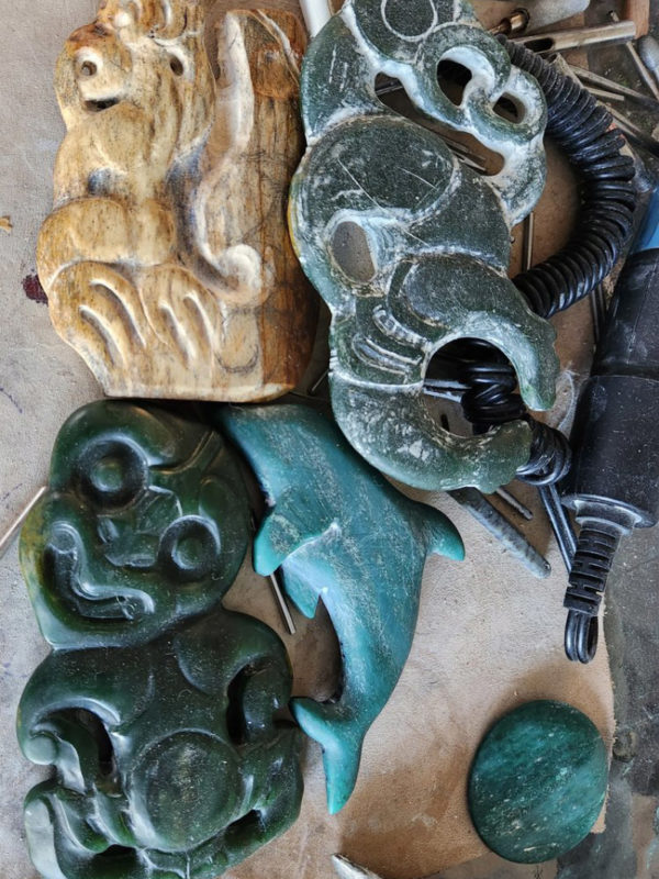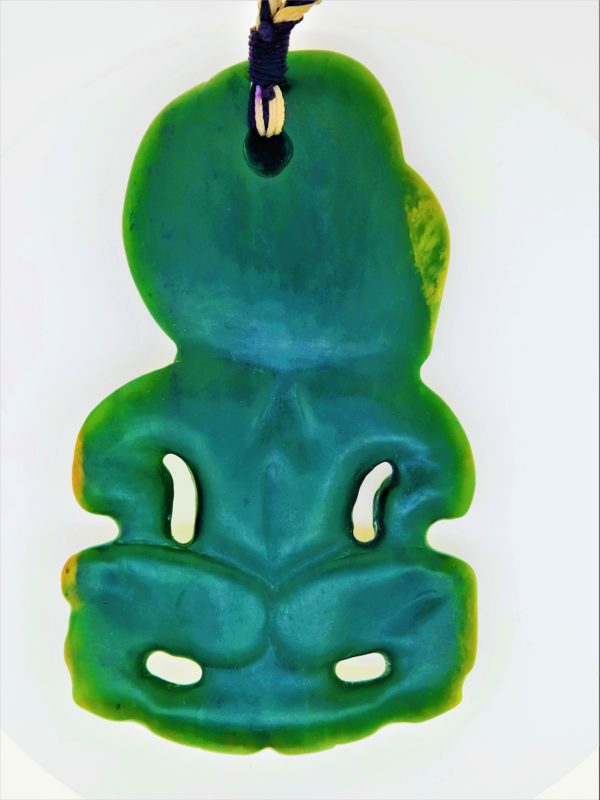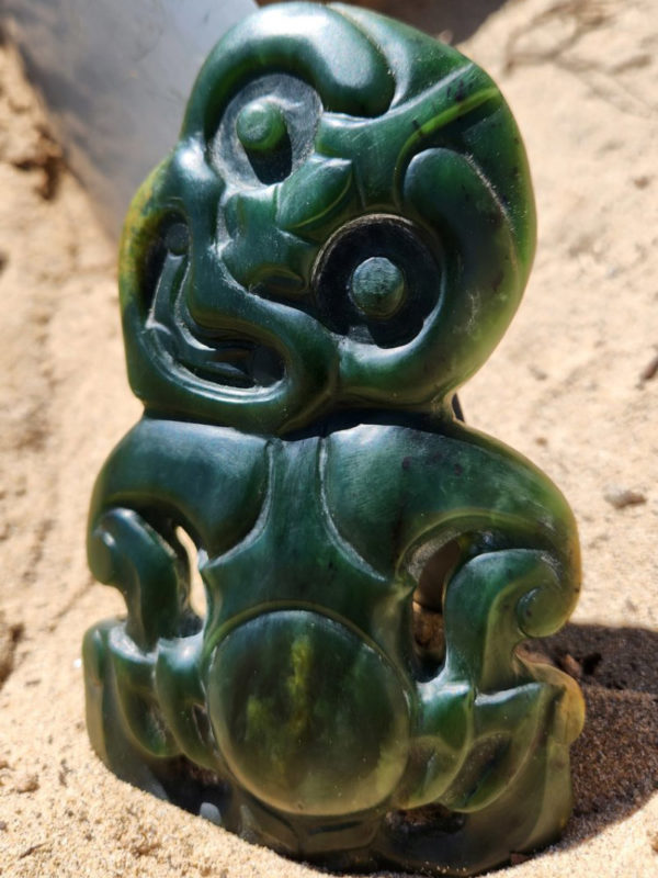 Marsden jade is the most refined of the Kahurangi type jade also known as Flower jade. It is distinguished by its depth of translucency and strength of hardness. Its limitations are only restricted by the mind of the artist. The Tiki you see here is known as the carvers Marquette and holds all the correct proportions, symmetry and relative symbolism. Not normally for purchase as it is used as a teaching and process of reference.