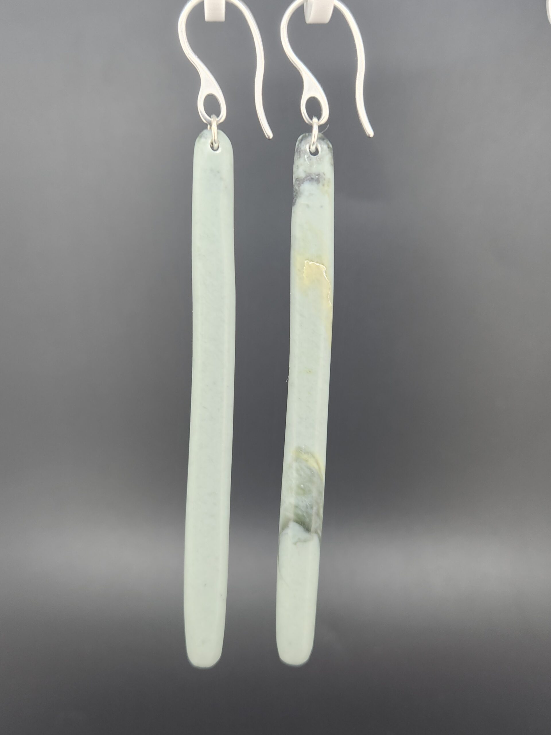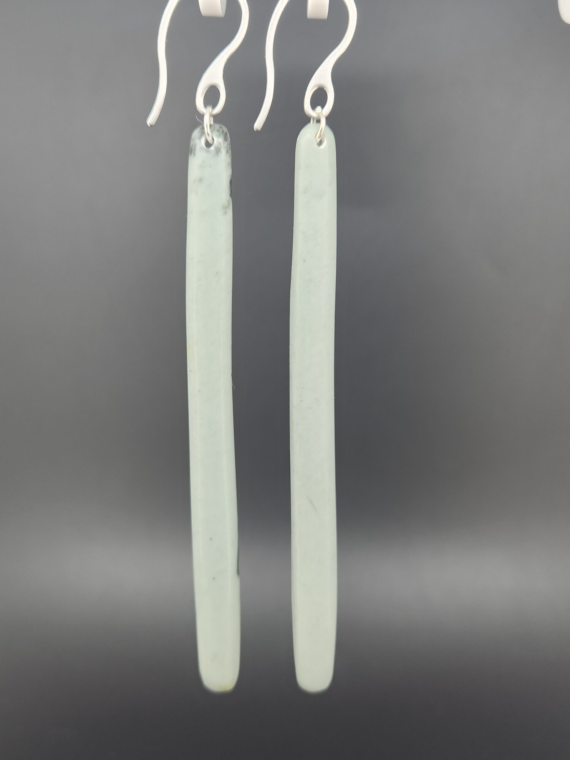 Carvers loving this pounamu due to it’s tight matrix. Stunning Whakatu grey jade with black mineralization peeking through on the back of these 83mm long earrings.