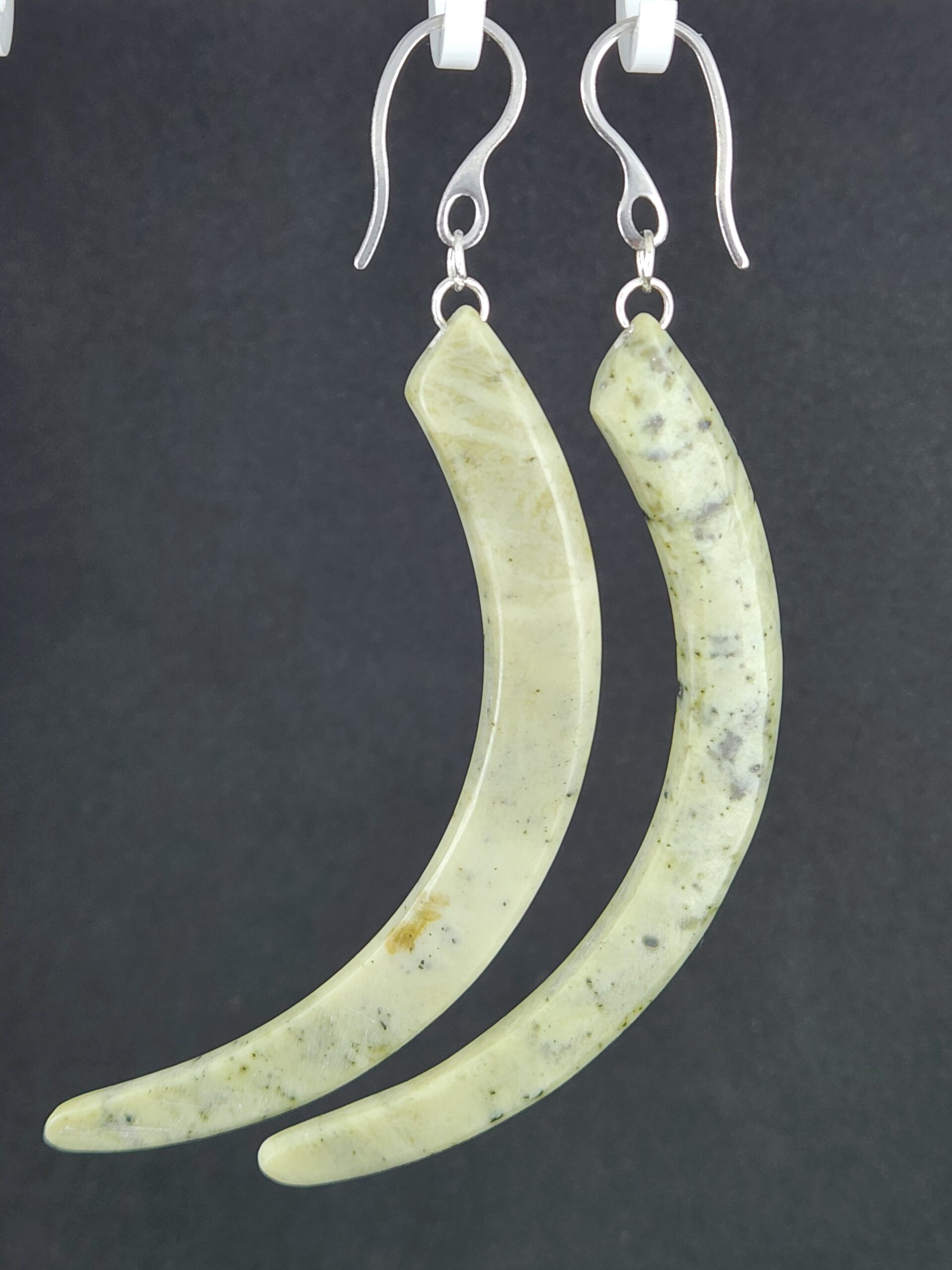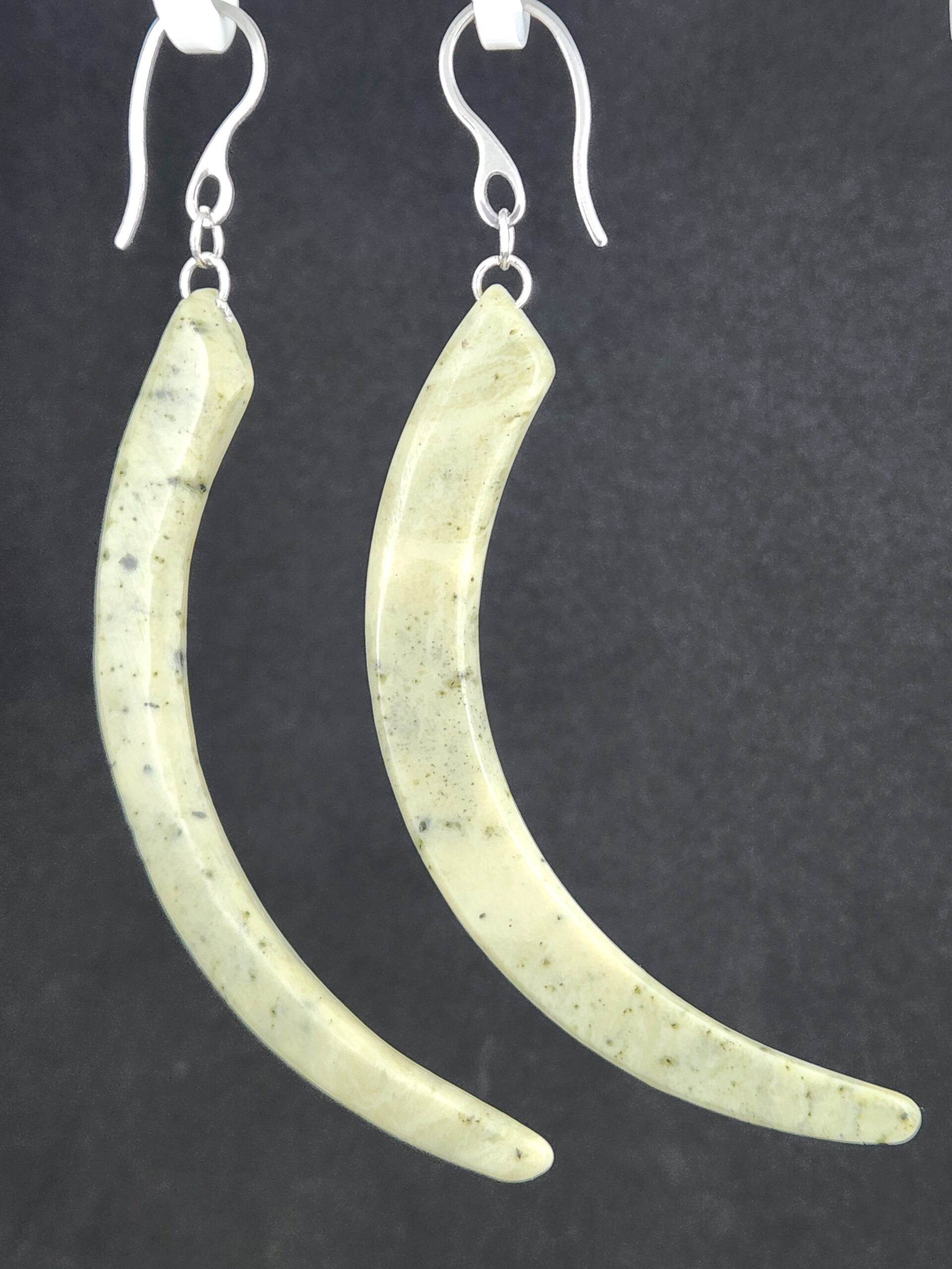 Stunning long kapeu earring crafted from Inanga sourced up the Aniseed Valley, Tasman. Inanga Pounamu is a New Zealand nephrite jade with a milky appearance with tones of light-olive and pearly white. Inanga jade is named after the freshwater native fish which is known to migrate from the moana (sea) to the awa (river). It is believed to carry the mauri (life force) of both the land and the people who have touched it.